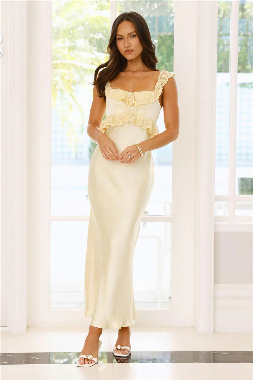 Embrace your dreamy style in the Waltzing In Romance Satin Maxi Dress. Featuring a tie neckline, off-the-shoulder straps, and boning to the top, it��s the perfect mix of elegance and whimsy. The flowy skirt, frill, and lace details make every twirl pure magic! Style with heels to impress.