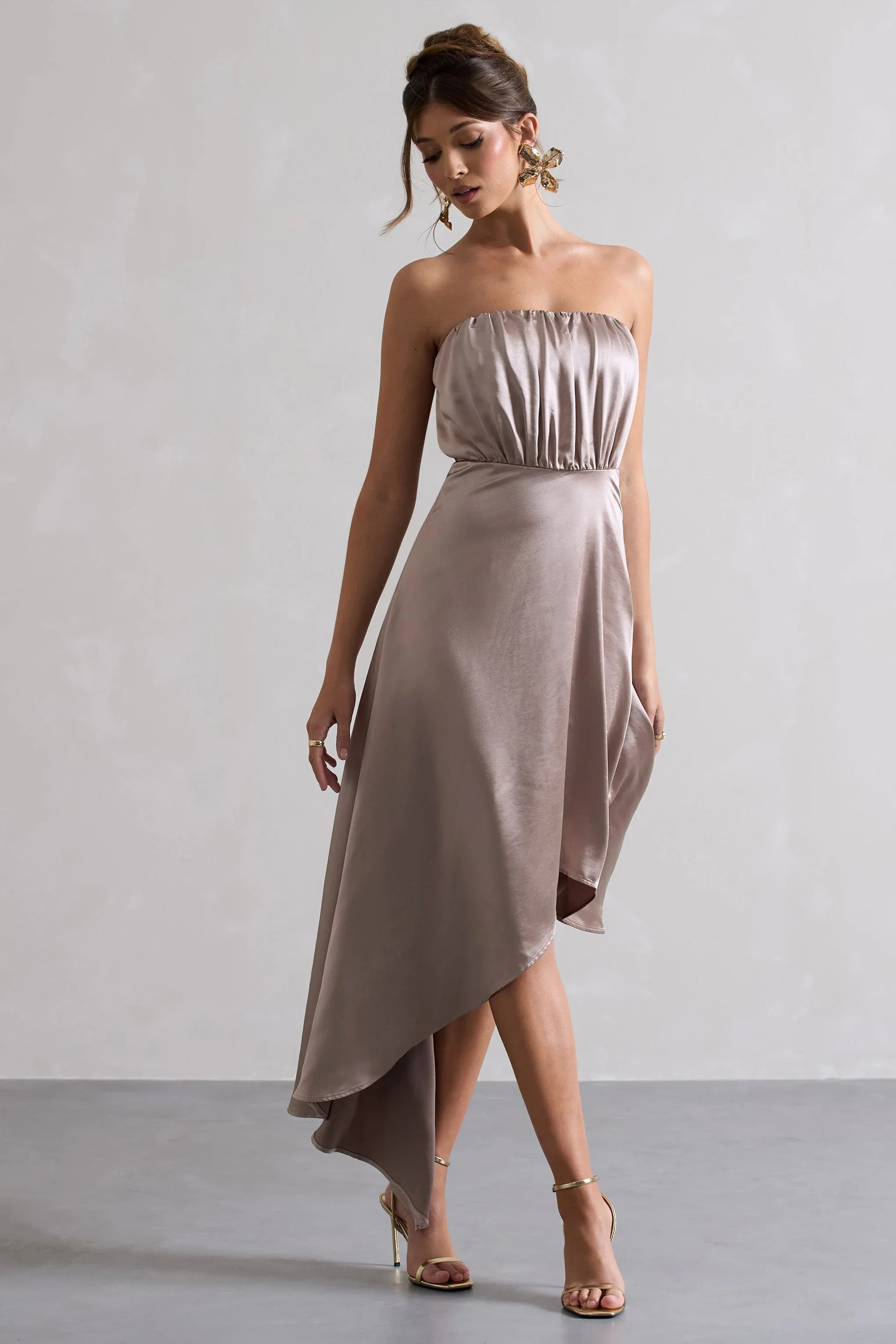 A maxi to see you through every occasion, Willa will have you reaching for it in your wardrobe time after time. Designed in a premium luxurious taupe satin that is beautifully flowing, Willa boasts a cinched in waist and artful asymmetric hemline. Style this strapless maxi with a sleek bun to show off its flattering neckline and some strappy stilettos to turn heads at your next event.