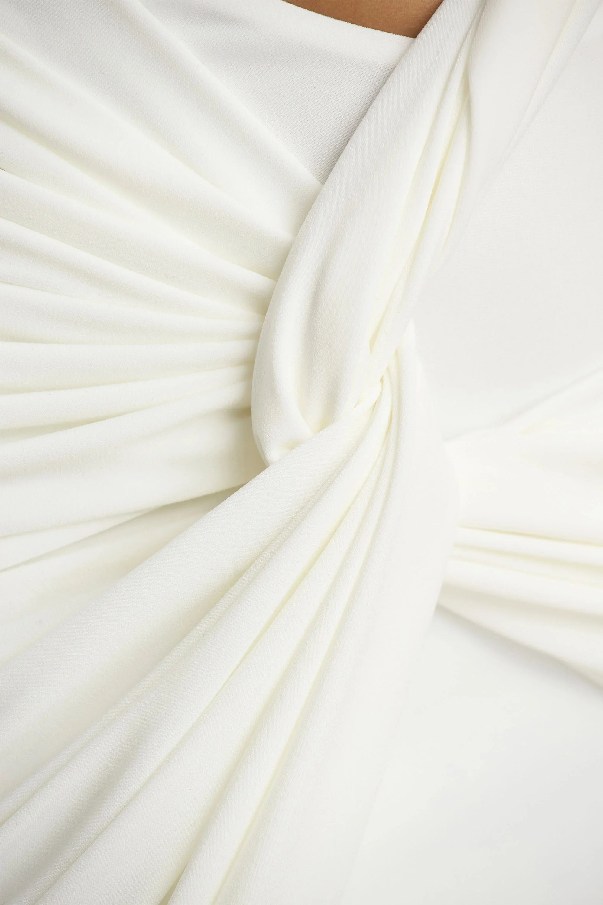 Command attention and steal the spotlight in Wilma. Crafted in a striking white shade of our premium stretch jersey, this mini dress is designed to flatter your curves and enhance your silhouette. The asymmetric neckline and body cut-out give this piece a modern edge that is complimented by the delicate twist detail. Finished with ruched detailing that ensures you're flattered from all angles, in WIlma you will exude confidence.