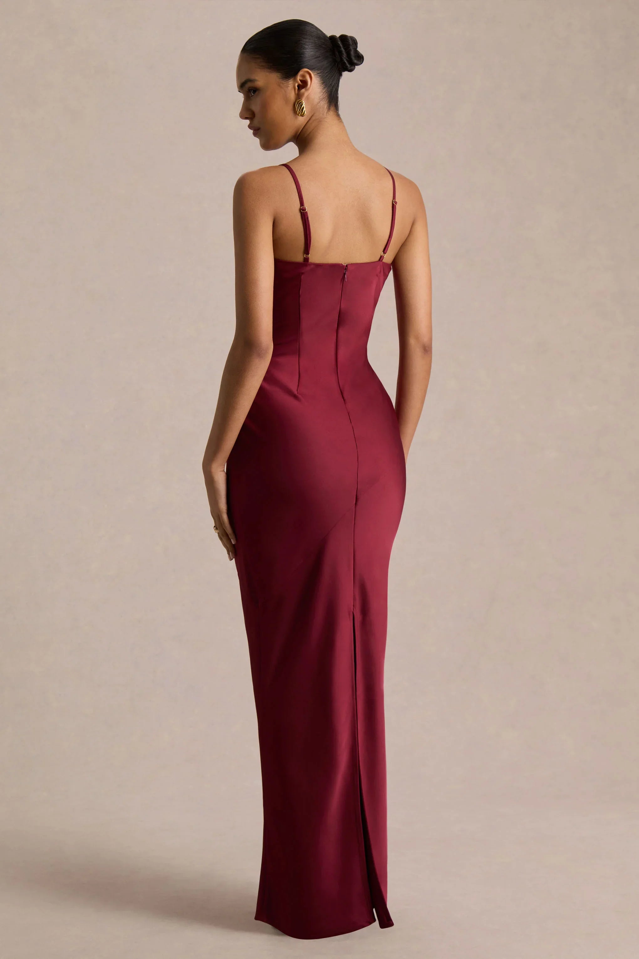 Introducing Yoli, a sleek take on modern glamour with a powerful edge. Cut from our premium burgundy satin, this maxi dress flatters the figure with a smooth, elegant finish. The high neckline exudes sophistication, while the twisted cape overlay adds a striking twist. Finished with a centre-back split for movement, Yoli is a bold yet timeless choice for statement occasions.