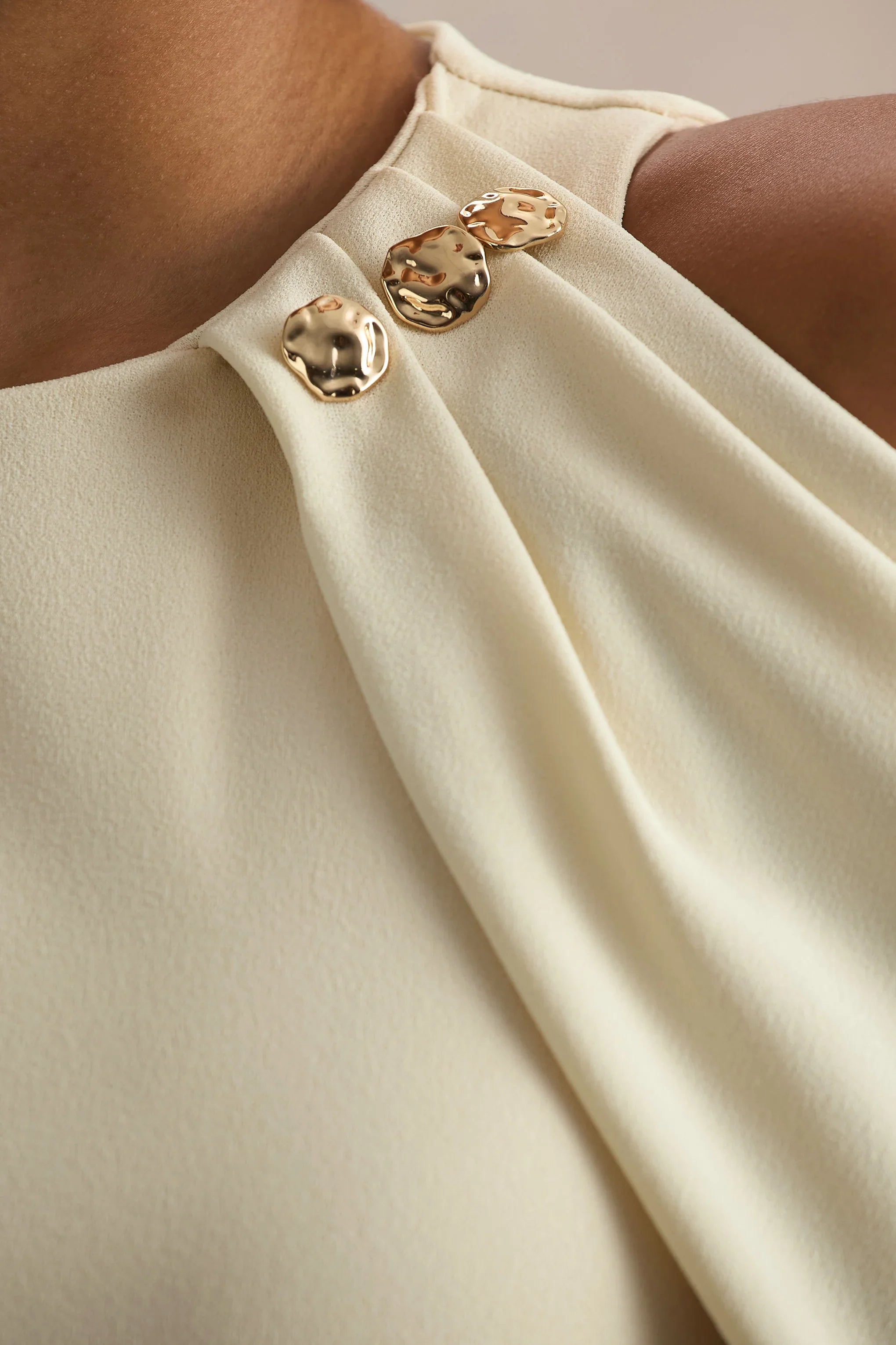 Step into elegance with Yulia, a timeless gown designed to capture the rooms attention. Crafted in a soft sand hue of our sculpting premium scuba crepe, this gown is designed to flatter every curve. The striking gold-detailed high neckline adds a chic touch, while the pleated cape overlay drapes gracefully across the shoulders, creating drama from every angle. With a floor-sweeping maxi hem and centre-back split for effortless movement, Yulia is made for grand entrances and unforgettable exits.