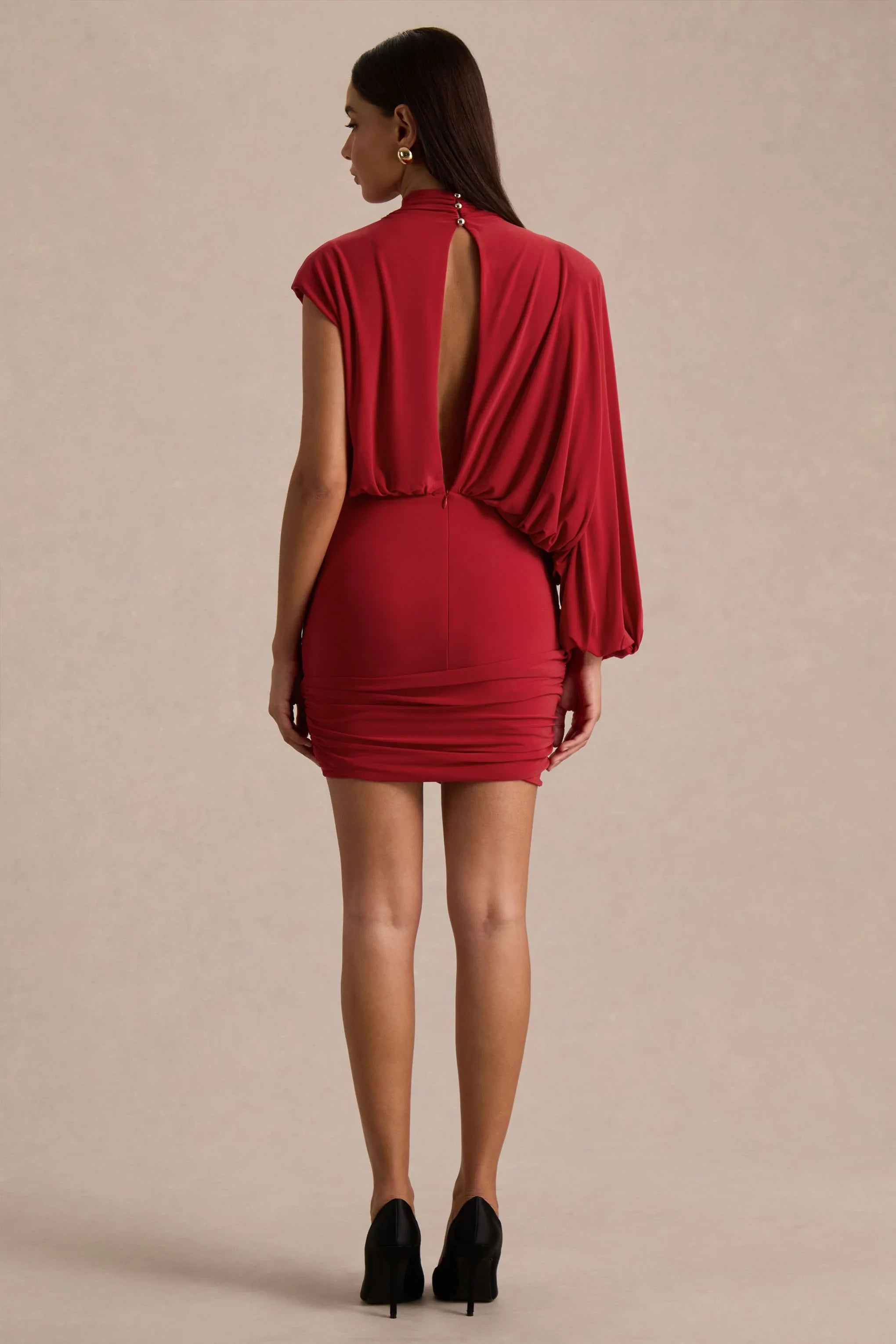 Make an entrance in Zelda a striking mini designed with effortless allure. Crafted in a bold red hue of our premium stretch jersey, this figure-enhancing piece is both sleek and sophisticated. The high neckline and single long sleeve create a modern, asymmetric edge, while the twist front detail and keyhole back add modern edge from every angle. Mini in length yet maximum in impact, Zelda is the epitome of confident glamour.