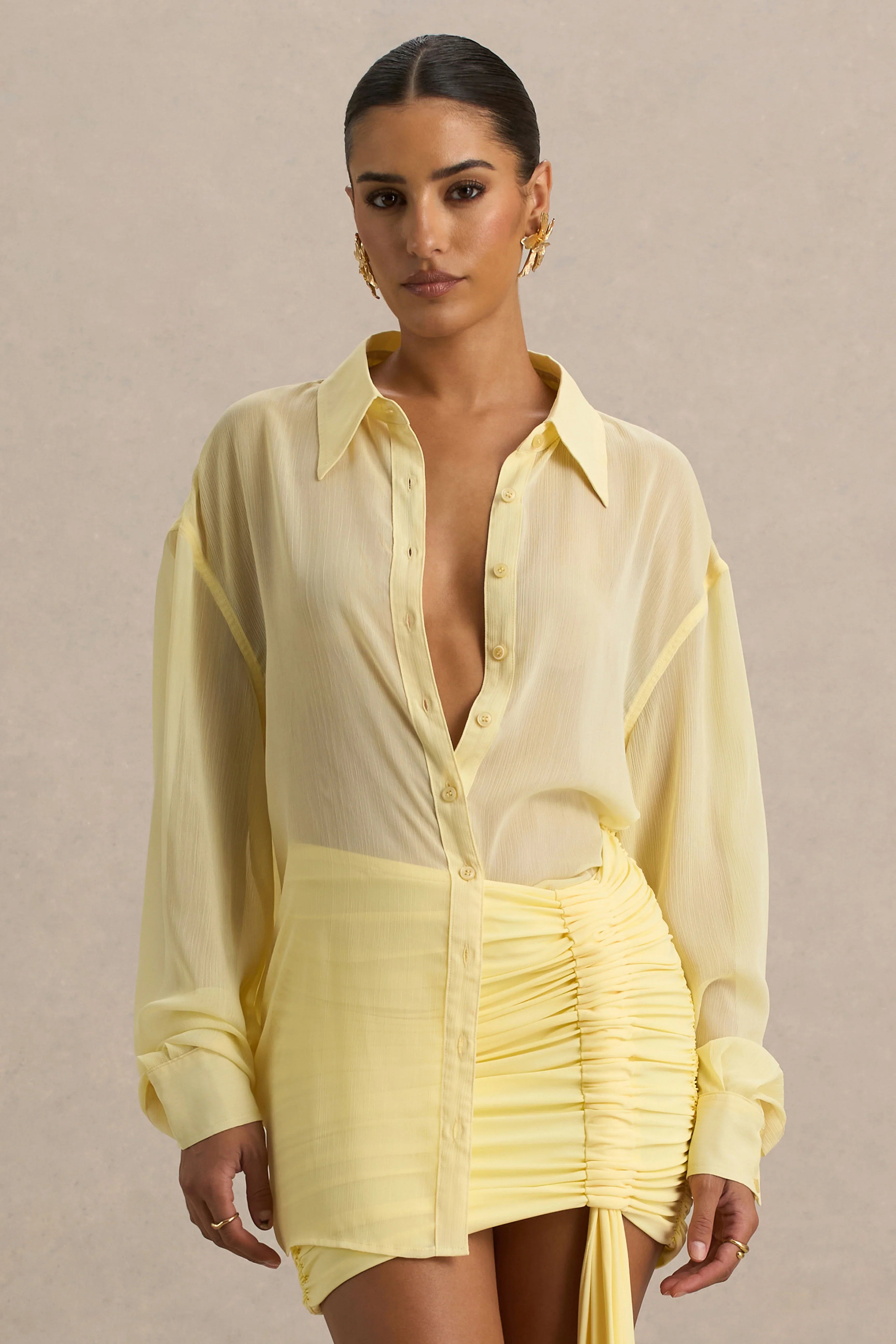 Say hello to the shirt of the season, Zinna, a must have in your suitcase this summer. Cut in a soft lemon hue of our premium crinkle chiffon, this shirt exudes effortless elegance. The plunge neckline, paired with the classic collar gives this piece gorgeous feminine structure that elevates any look. Designed with a sheer finish makes this shirts styling options endless, pair on top of swimwear for a chic beach club vibe or with a sleek mini skirt and heels for a stunning dinner outfit.