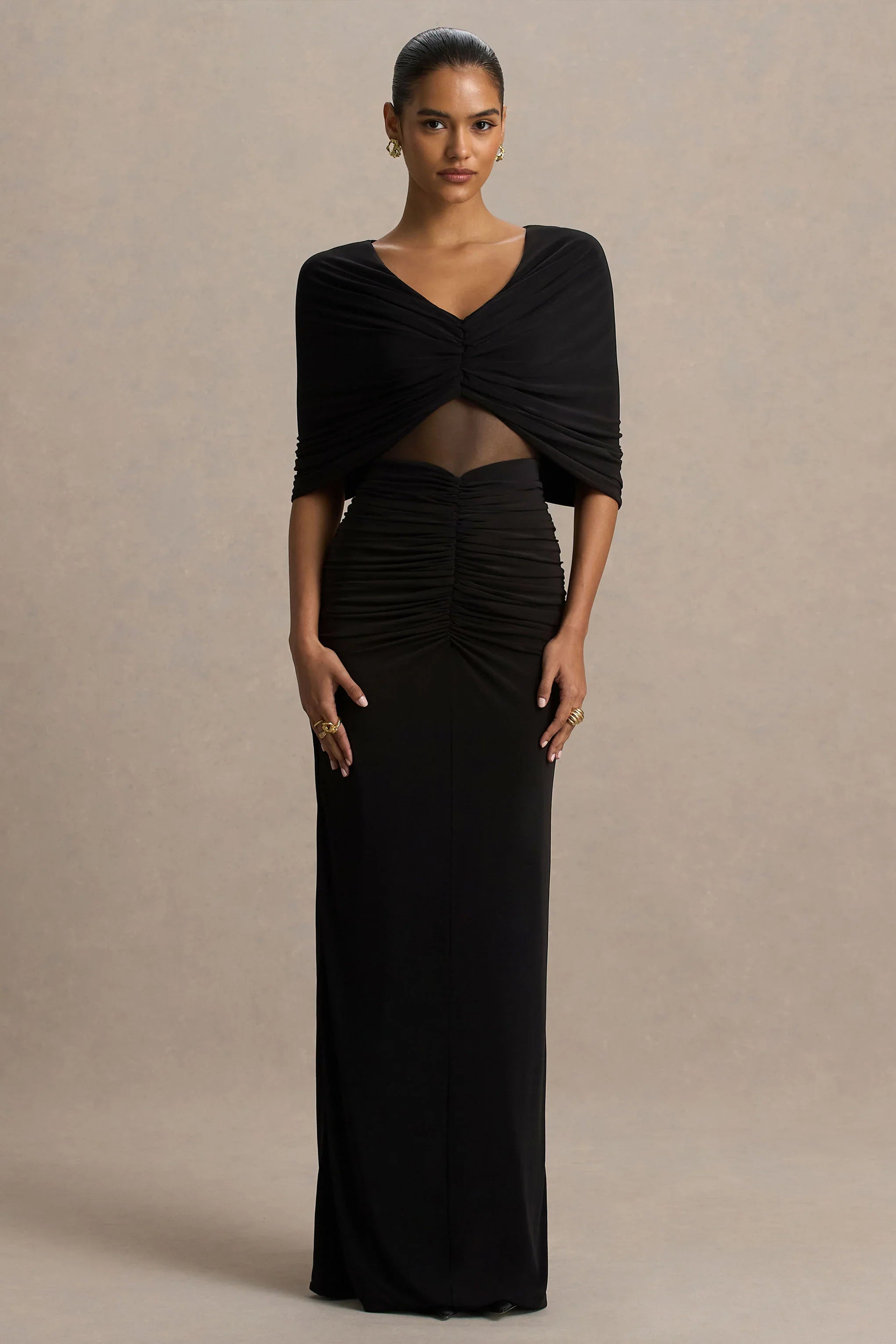 A true showstopper, Zinnie is designed to sculpt and flatter while making a bold statement. Crafted from our premium black stretch jersey, this maxi dress turns heads in any room. Featuring a daring mesh panel that's balanced with elegant draped detailing across the bodice and cape sleeves. The ruched finish creates a cinched, hourglass effect, flowing into a sleek floor-length skirt for a powerful silhouette. Zinnie is the perfect piece for evenings that demand confidence and allure.